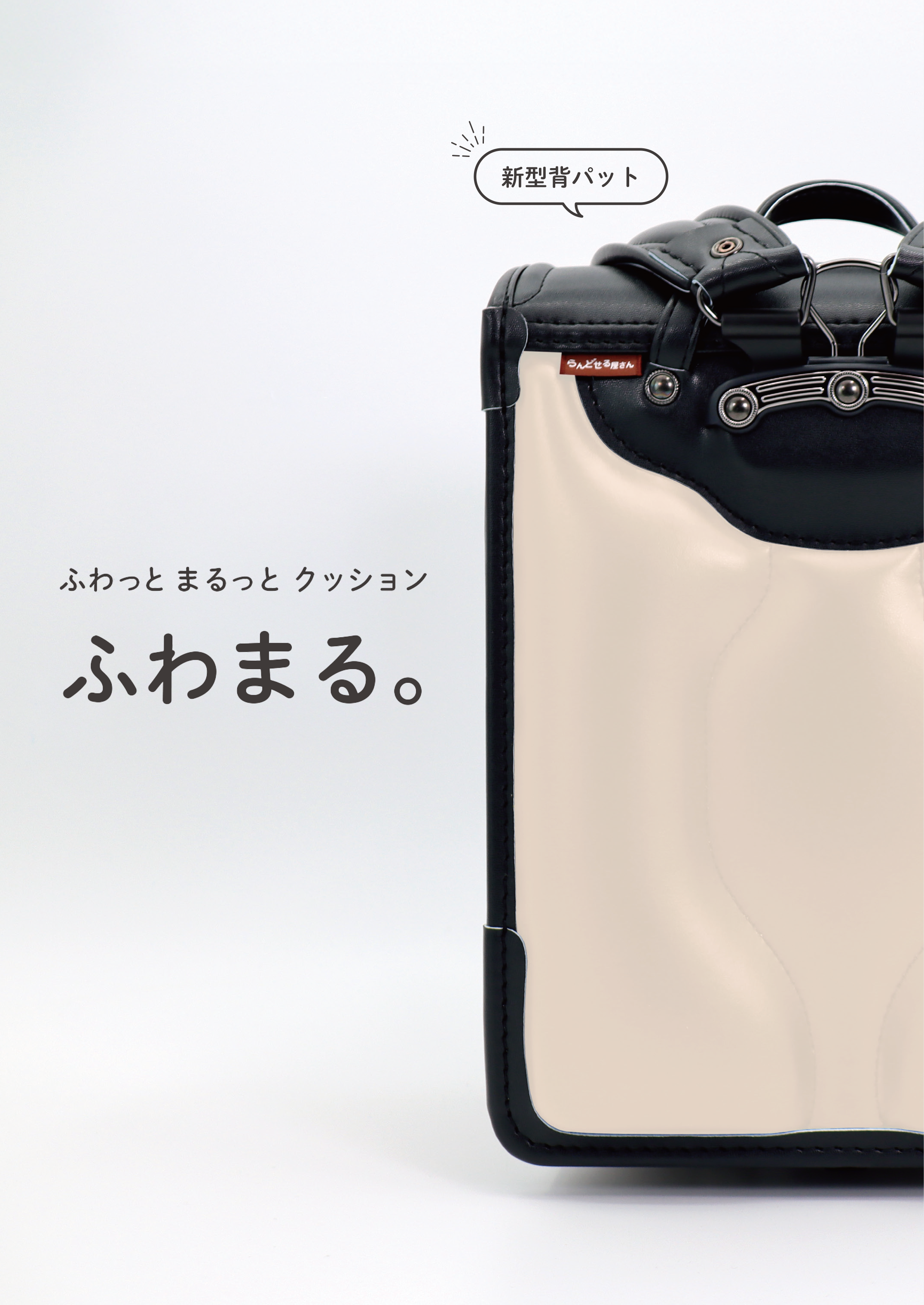 なだらかな曲線を描く『ふわまる。』の接地面は、完全新設計で背中全体に密着しやすくなるようにデザインしました。 背カン取付部が身体にあたりにくい効果や、 部位によって二層構造のクッション材に高低差をバランスよく設けることによって、 さらなる優しいフィット感、クッション性、通気性を実現しています。